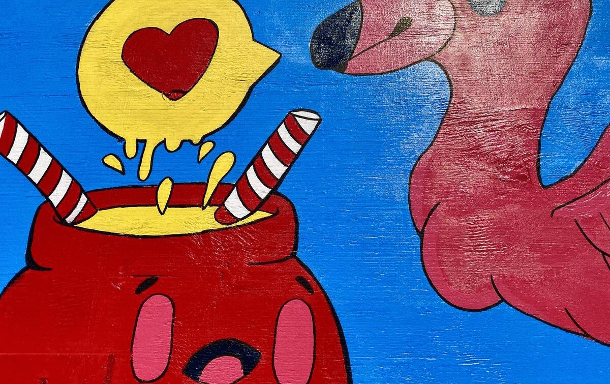 “The inspiration behind this art for the mural was based on the idea of a fun time with one another shown by every character interacting with each other and the colorful and vibrant retro dining aesthetic of mom's kitchen. The characters consisted of ducks, flamingos, some of the artist personal characters with masks with friendly expressions and dogs because you can't live in Astoria without having an adorable companion. The whole experience was incredible not only because people passing by, loving the vibrant colors and characters but also seeing the whole thing unfold in their neighborhood.”